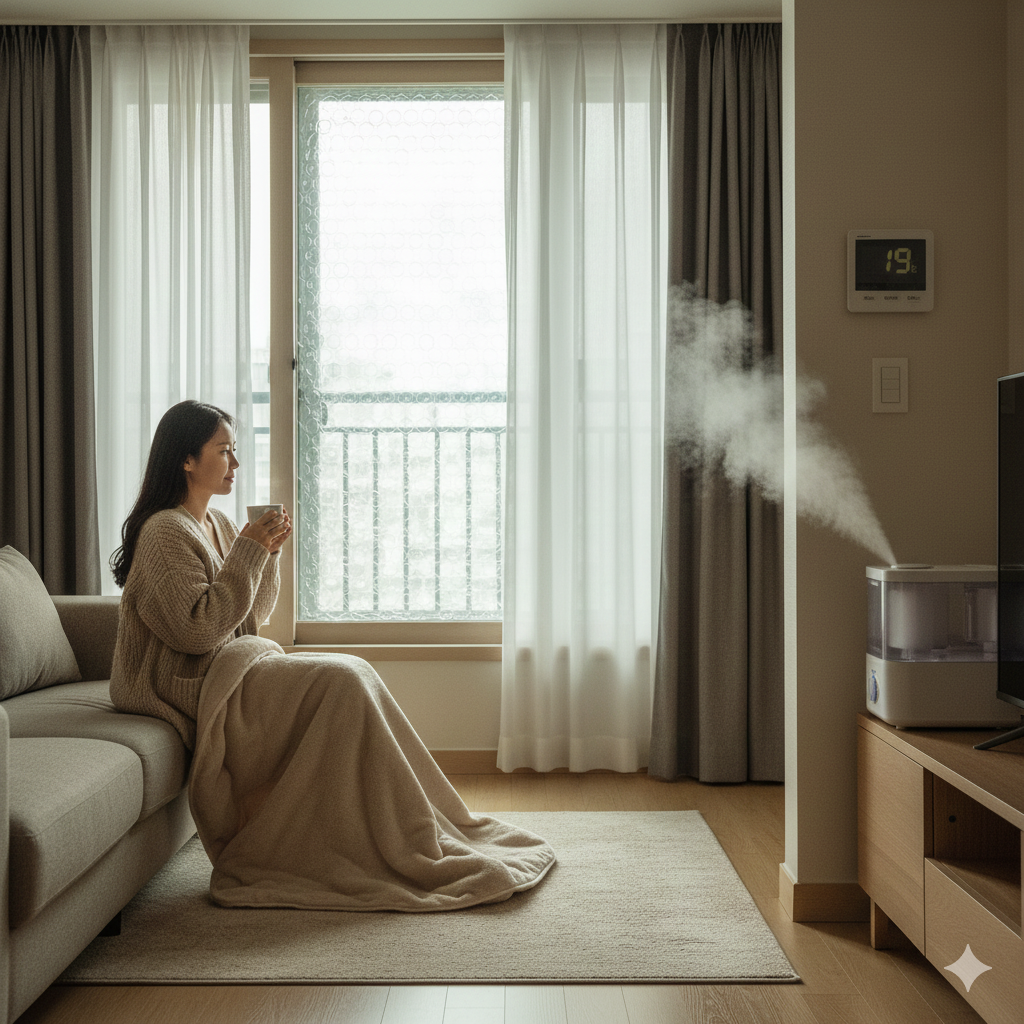가습기를 통해 습도를 40~60% 정도로 유지하면 체감 온도가 올라가 **실내 온도 설정**을 평소보다 1~2도 낮게 유지해도 충분히 따뜻함을 느낄 수 있습니다. 이는 곧장 가스비 절감으로 이어지며, 호흡기 건강까지 챙길 수 있는 일석이조의 방법입니다.