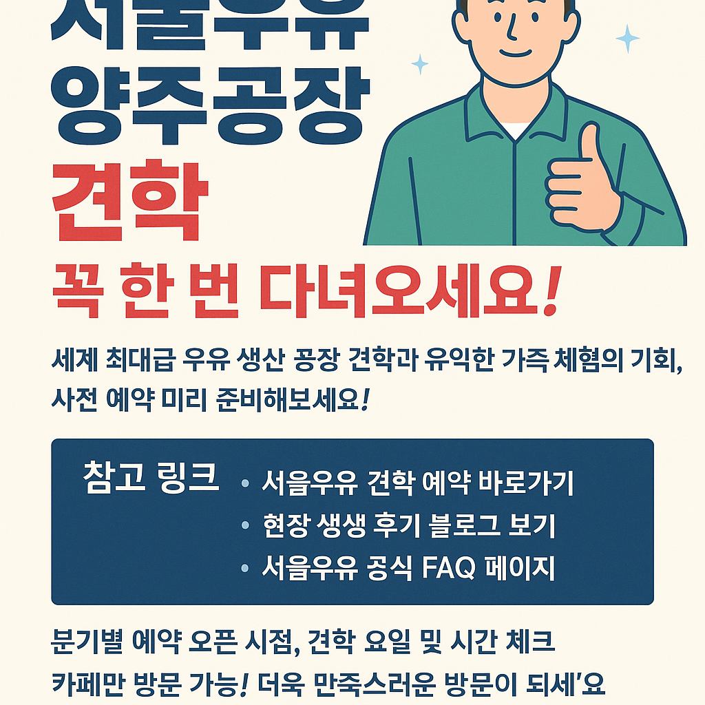 여러분! 우유가 만들어지는 과정을 직접 눈으로 보고 체험해볼 기회, 서울우유 양주공장 견학으로 경험해보신 적 있으신가요? 아이들과 함께하는 특별한 가족 나들이를 찾고 계셨다면 이보다 더 좋은 기회는 없을 거예요. 세계 최대 규모의 우유 공장에서 신선한 유제품의 여정을 따라가보는 뜻깊은 체험, 오늘은 그 모든 정보를 쉽고 알차게 정리해드립니다!