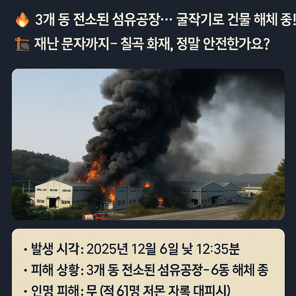 - 2025년 12월 6일 낮, 칠곡 섬유공장에서 대형 화재 발생