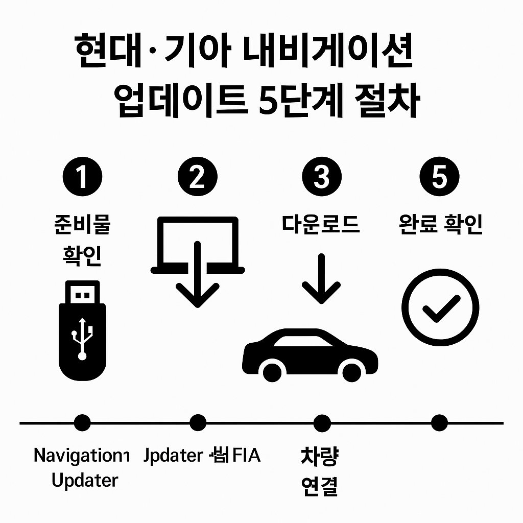 지금까지 현대·기아 차량의 내비게이션 업데이트 방법을 알아보았습니다. 복잡해 보일 수 있지만, 실제로는 딱 5단계로 구성된 간단한 절차입니다: