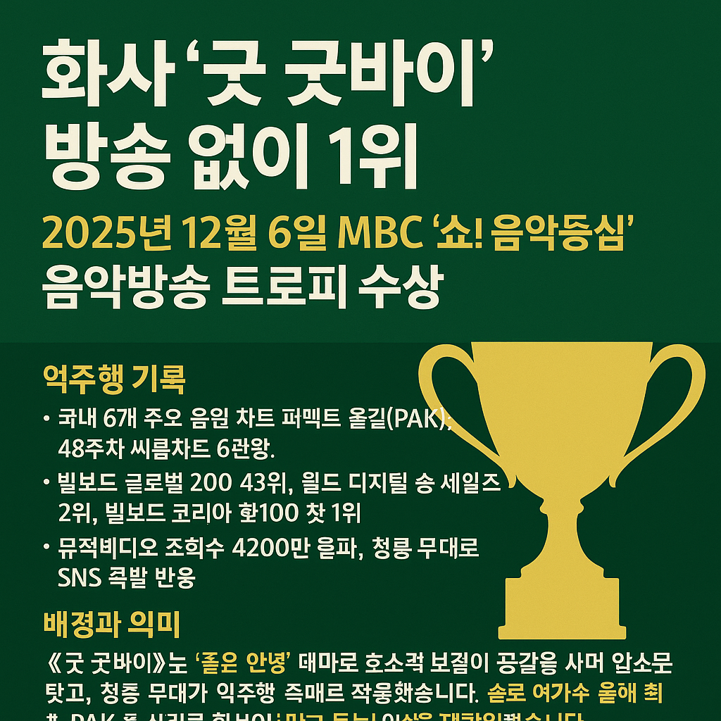 화사의 ‘굿 굿바이’는 단순한 음악적 성과를 넘어서, 진심과 실력이 만들어낸 역주행의 진수를 보여줬습니다. 출연 한 번 없이 음악방송 1위를 달성한 이 사례는, 앞으로의 K-POP 역주행 공식에 깊은 영향을 줄 것으로 보입니다. 청룡영화상 무대와 감성적인 메시지, 공감의 힘이 결합된 이번 성공은 ‘좋은 음악은 결국 통한다’는 진리를 다시금 확인시켜줬죠.