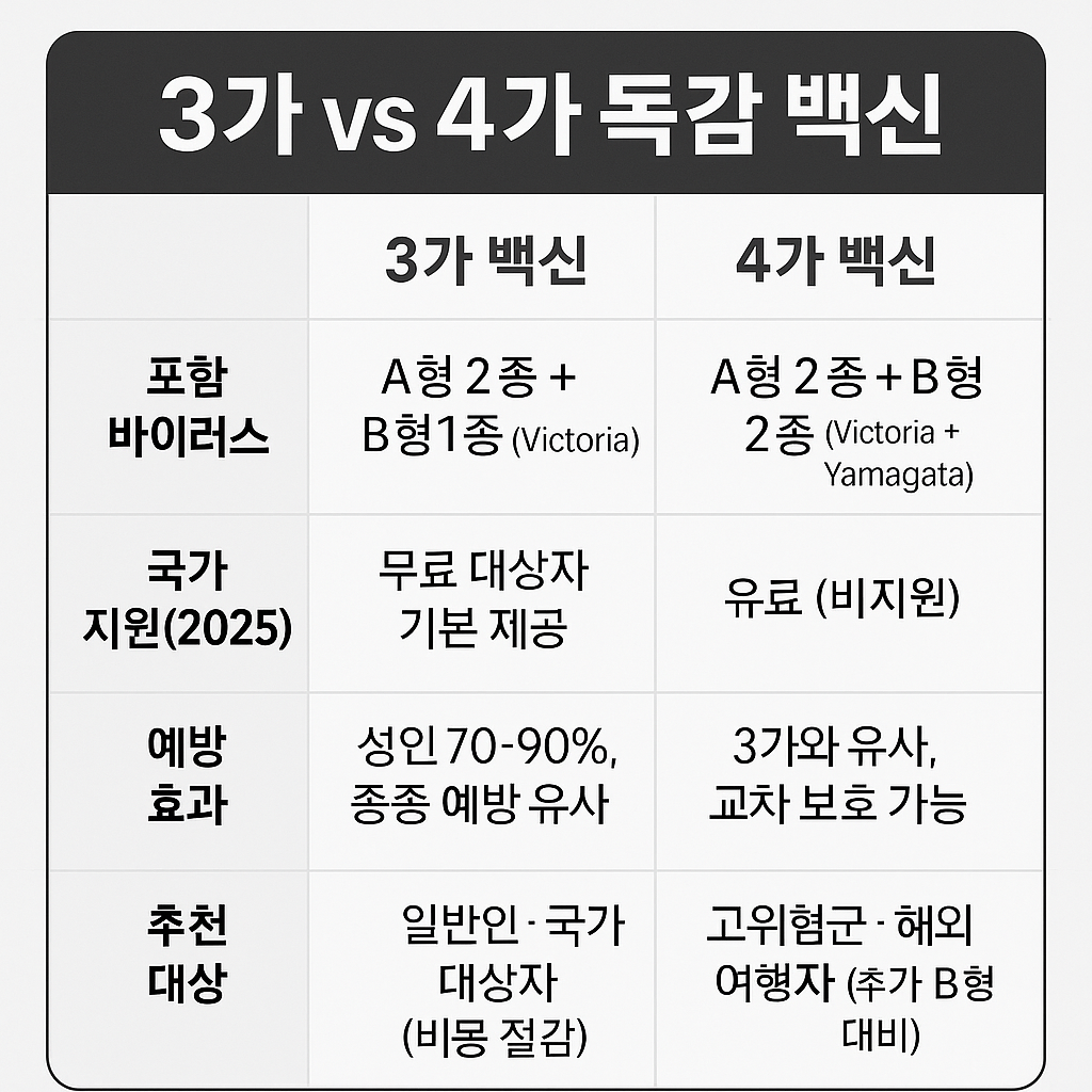 독감 백신은 3가(Tri-valent), 4가(Quadri-valent) 두 종류로 나뉘며, 그 차이는 포함된 바이러스 균주의 수에 있습니다. - 3가 백신: A형 2종(H1N1, H3N2) + B형 1종(Victoria 계열) - 4가 백신: 3가 구성 + B형 야마가타 계열 추가 즉, 4가는 3가보다 1종의 B형을 더 커버하며 과거에는 어린이, 고령층, 고위험군에게 4가 백신이 권장되기도 했습니다. 하지만 2025년부터는 야마가타형 독감이 3년째 검출되지 않아 세계보건기구(WHO)와 국내 질병관리청 모두 3가 중심 전략으로 바꾸고 있습니다. 실효성은 거의 차이 없고, 공급 안정성과 비용 측면에서 3가가 유리하죠.