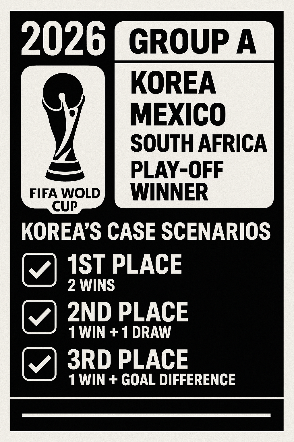 조 1위 시나리오: 멕시코와 비기고, 남아공과 유럽 팀 중 최소 1팀을 이긴다면 2승 1무(7점) 또는 2승 1패(6점)으로 조 1위를 노릴 수 있습니다. 조 2위 시나리오: 멕시코에 패하더라도 남아공과 유럽 팀에 각각 1승 1무(4점 이상)라면 충분히 2위를 확보할 수 있습니다. 조 3위 시나리오: 1승 1무 1패(4점) 혹은 1승 2패(3점)이라도 골득실이 좋으면 상위 3위 팀에 포함될 수 있습니다. 탈락 시나리오: 무승(0점), 혹은 2무 1패(2점) 등이라면 사실상 32강 진출은 어려운 상황입니다.